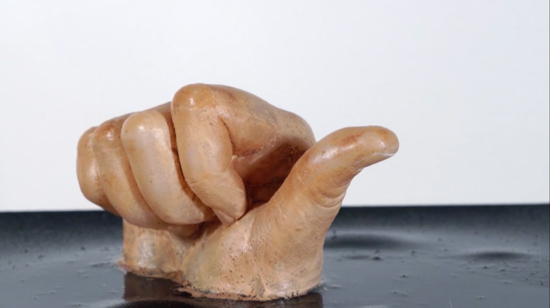 vidéo linéaire, 5’50, 2012 Tout va pour le mieux. La main, pouce levé, lentement sombre.